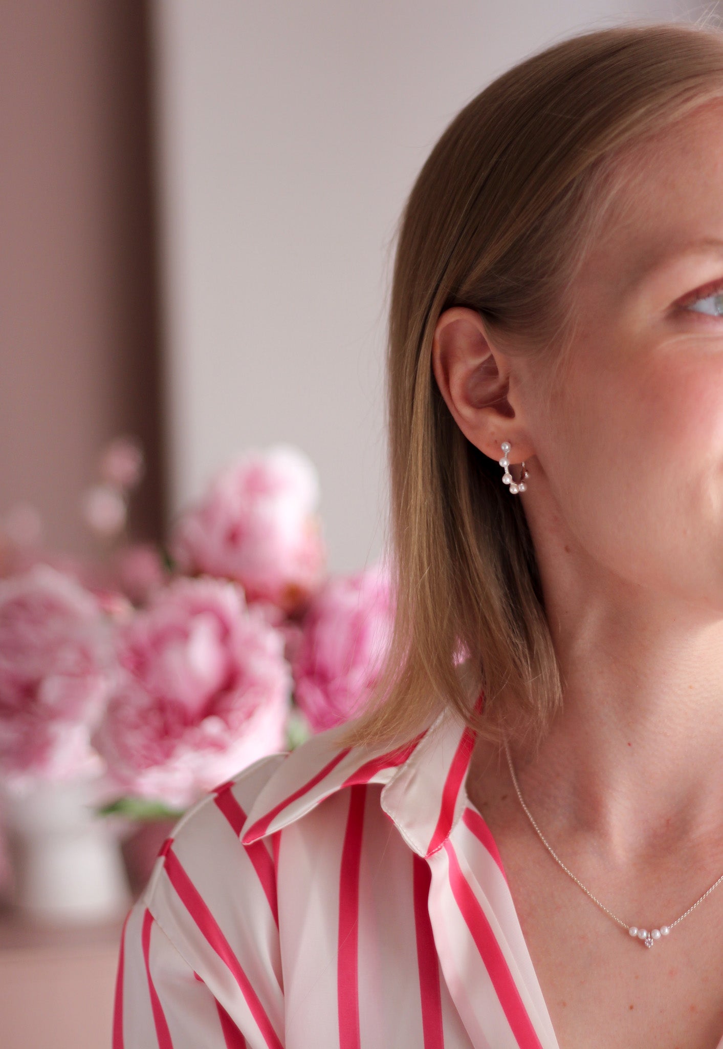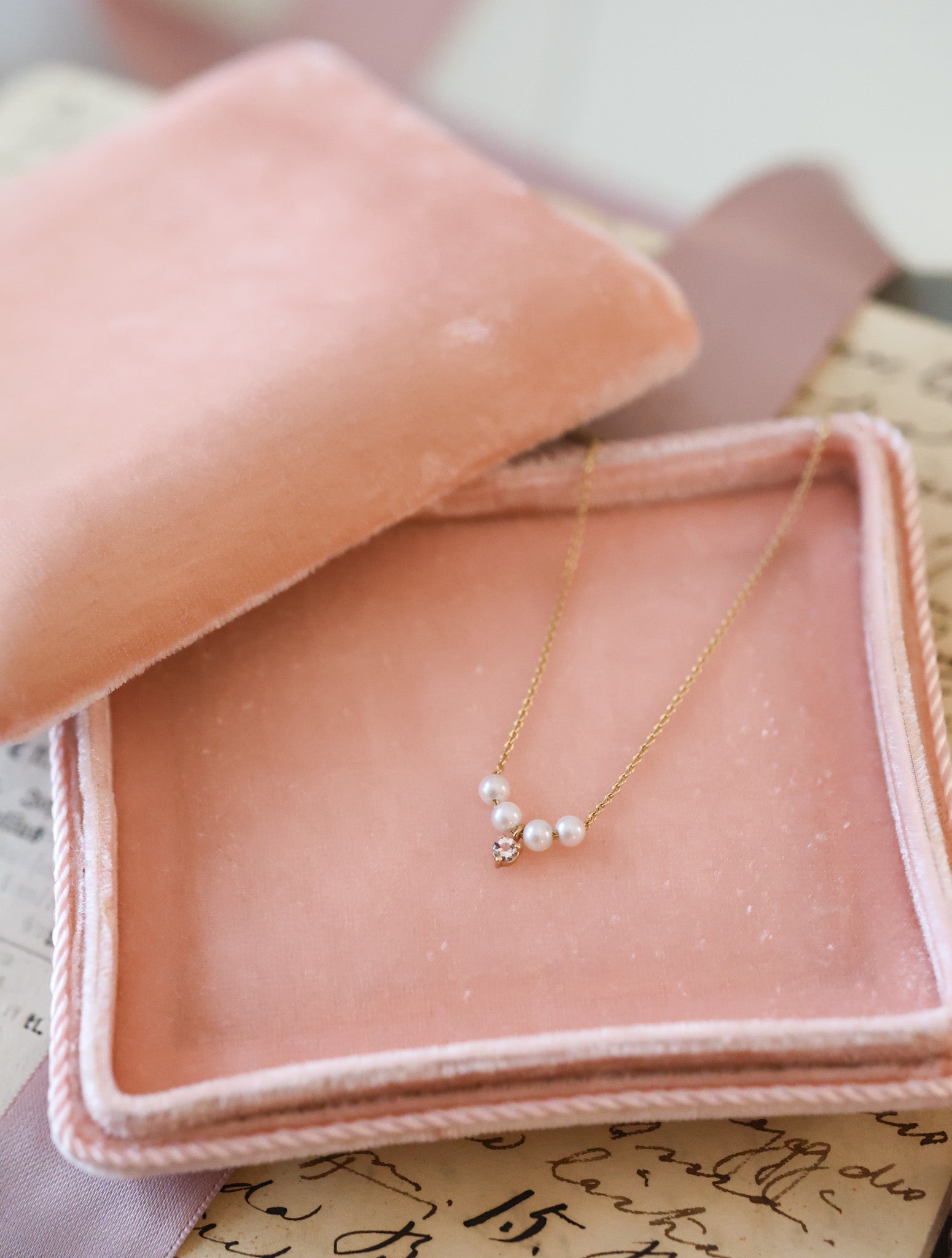 Pienet, hohtavat Akoya-helmet asettuvat kauniisti ketjuun ja korostavat keskellä loistavaa vaaleanpunaista morganiittia.