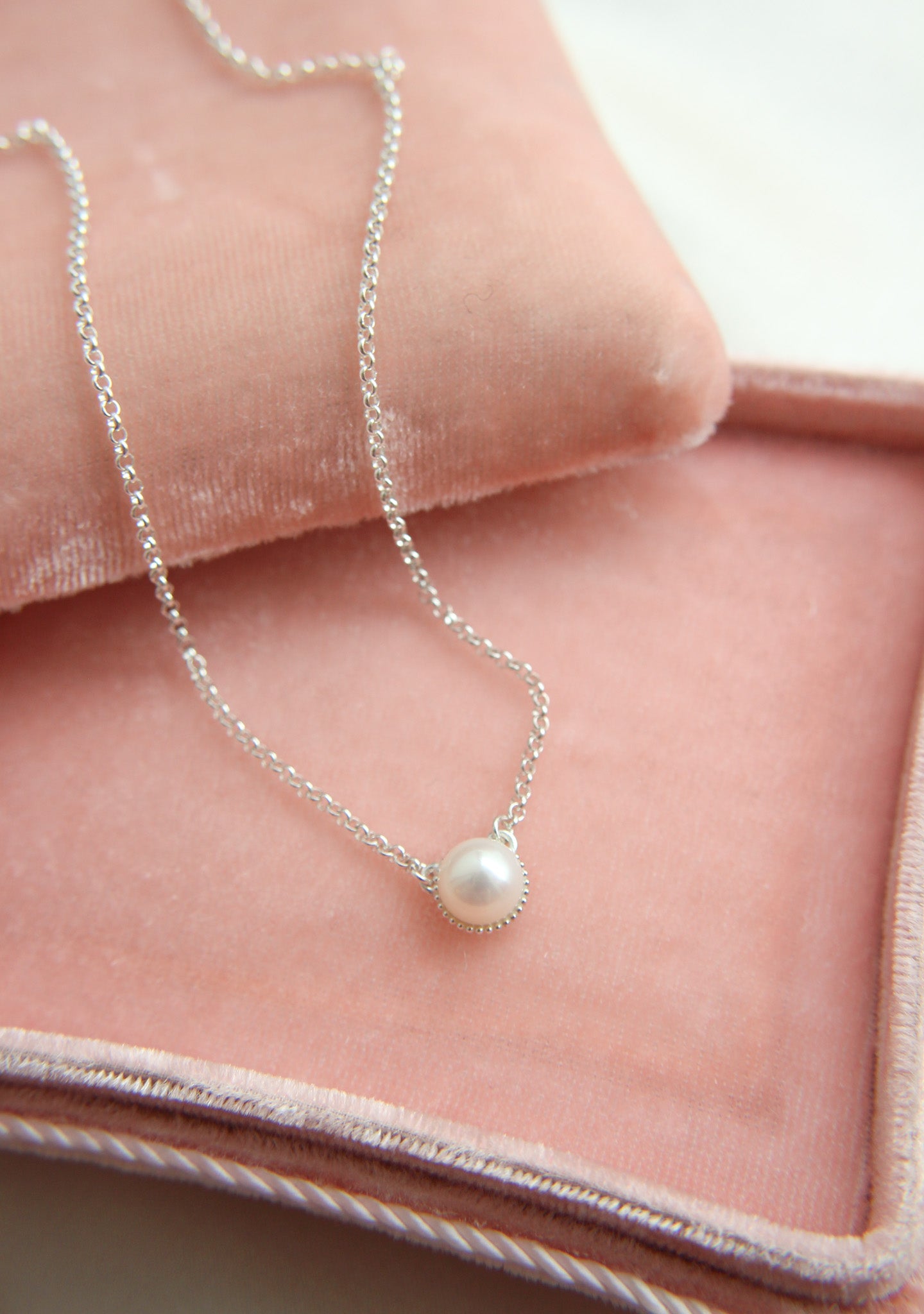Kaunis makeanveden helmi kaulakoru, jossa pääsosassa on kaunis valkoinen helmi. Helmen ympärillä on kaunis hopeinen koristereuna ja tausta on kaunis yksityiskohtineen. Klassinen helmikaulakoru herkillä yksityiskohdilla tekee siitä elegantin kokonaisuuden.