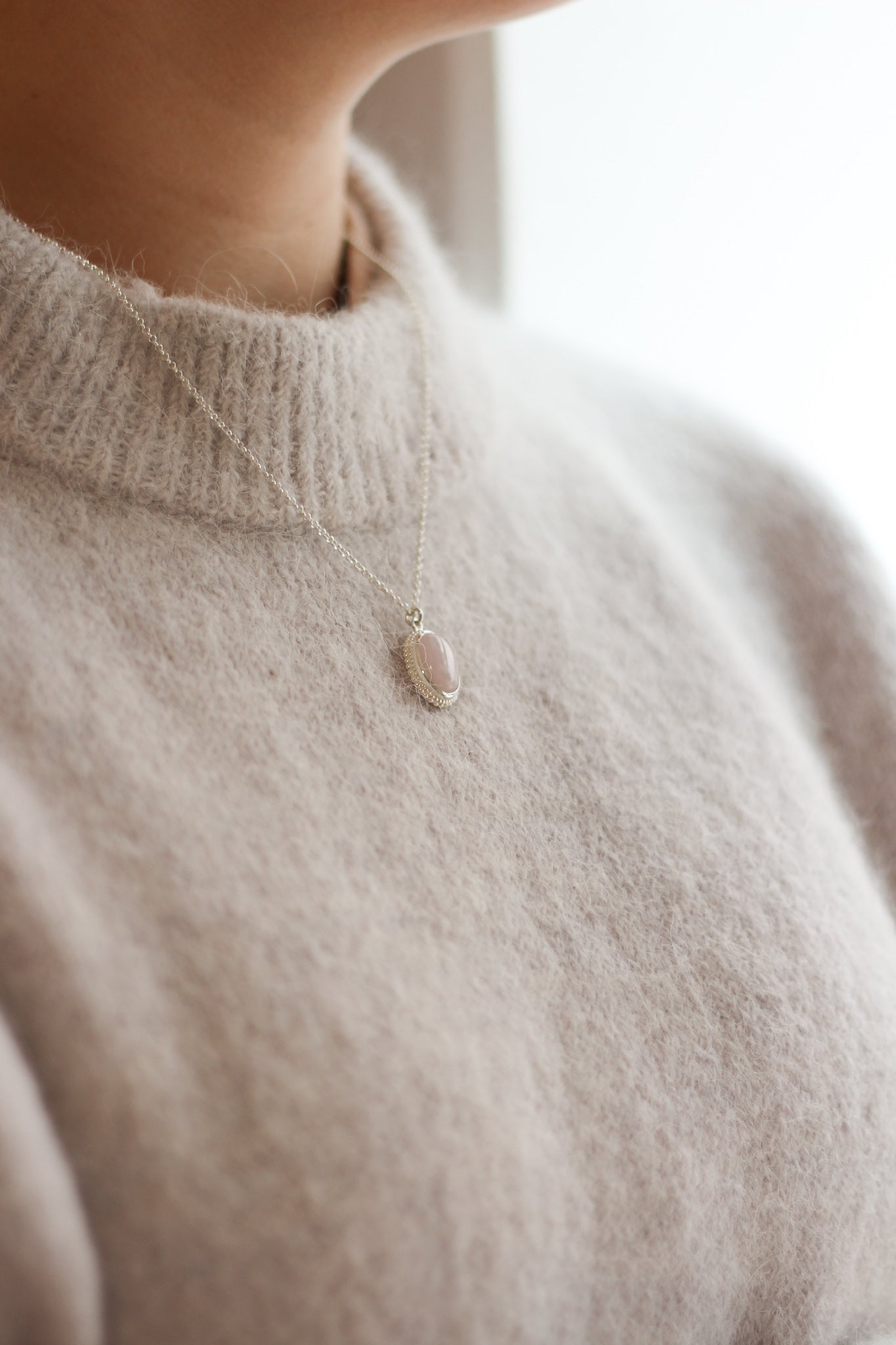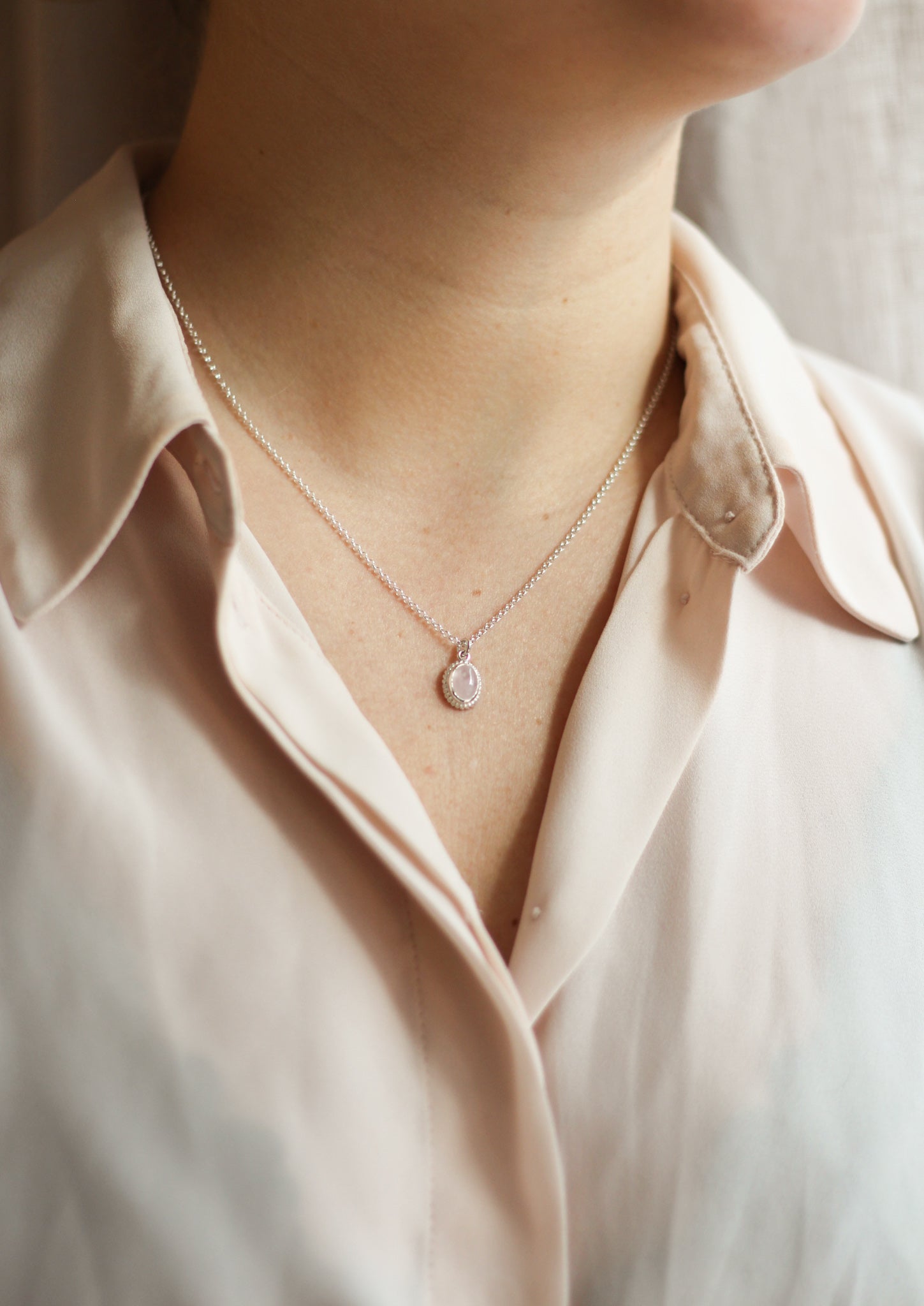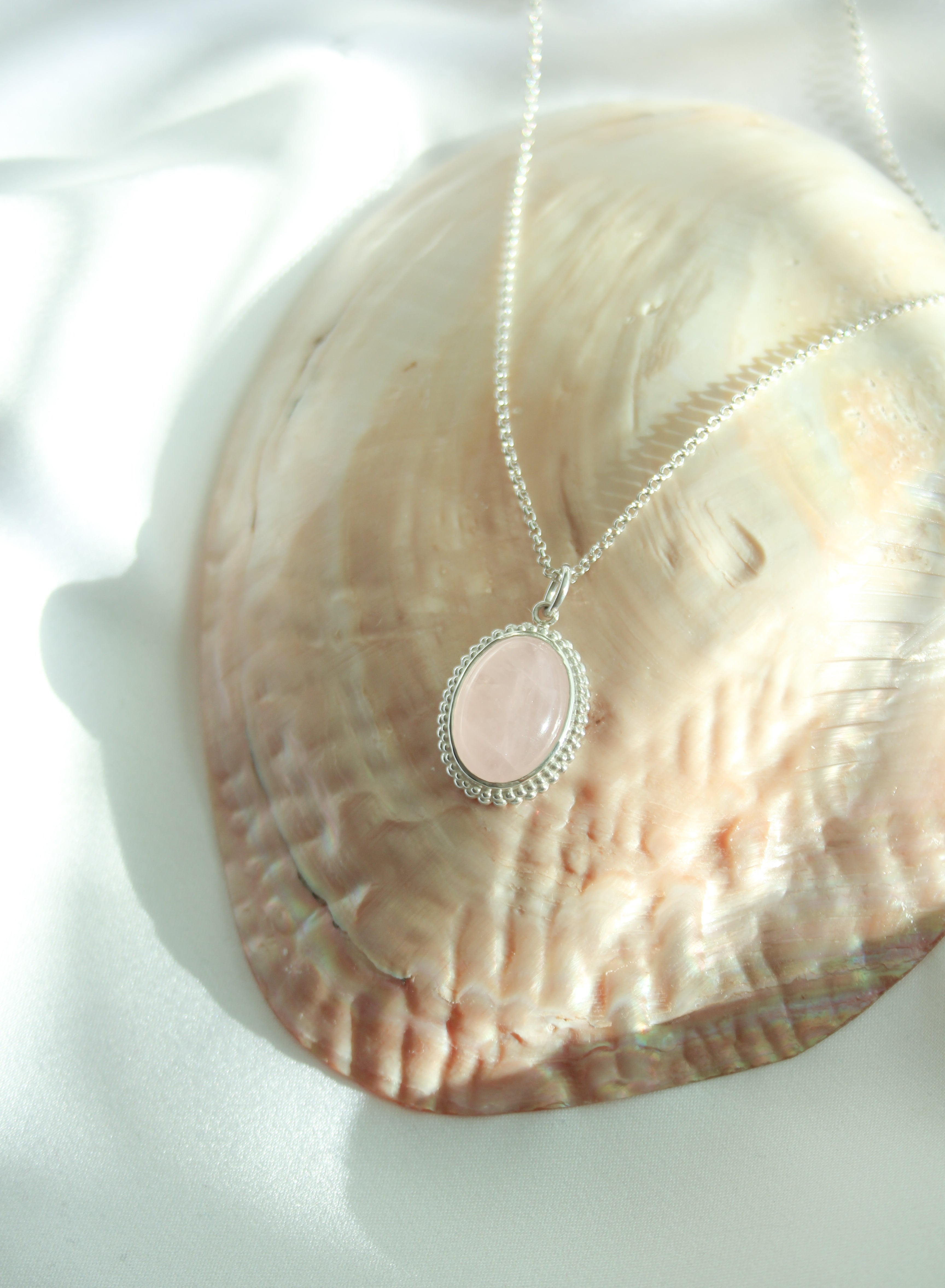 Siro ja kevyt kaulakoru, jossa hehkuu lempeä ruusukvartsi.